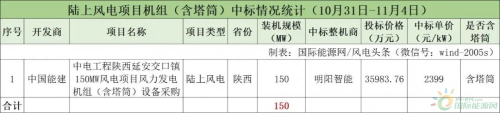 中国能建开标150MW,由明阳智能中标。