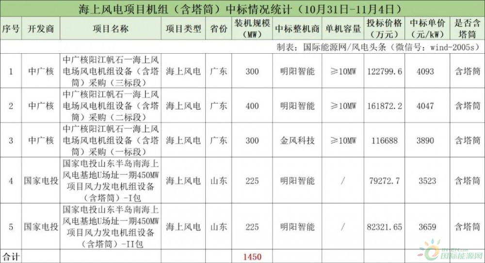 据国际能源网/风电头条(微信号:wind-2005s)不完全统计,本周含塔筒海上风电项目5个,规模总计1450MW,项目中标均价为3842元/kW。