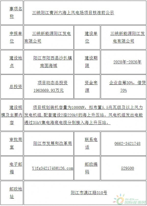 近日,三峡阳江青洲六海上风电场项目获阳江市发改委核准,该项目规划装机容量为1000MW,拟布置5.5兆瓦级及以上风力发电机组,配套建设2座220kV的海上升压站。项目总投资1963669.93万元,建设地点在阳江市阳西县沙扒镇南面海域,建设单位为三峡新能源阳江发电有限公司。
