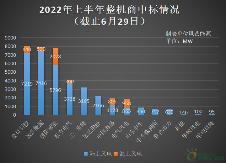 根据今年上半年中标统计,拿标超2GW的整机商有6家。东方电气拿标超4GW,三一重能拿标超3GW,运达股份拿标超2GW。中国海装、电气风电接近2GW。