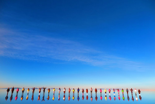 乌尤尼盐湖整体的高低差在50cm以内,是世界上最平的地方,雨季时,雨水不会流动,大地仿佛贴了一层薄膜,以天空倒映在湖面上的“天空之镜”而闻名。