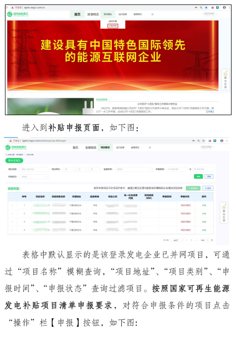国家电网有限公司为符合中央财政补贴条件的可再生能源发电项目提供补贴项目清单申报服务。申请纳入项目清单的新能源发电企业通过国网新能源云平台(网址:http://sgnec.esgcc.com.cn)开展申报工作。主要流程如下: