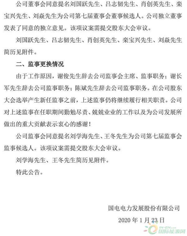 1月23日,国电电力发布《关于董事、监事辞职并更换部分董事、监事的公告》,公告显示:由于工作原因,乔保平先生辞去公司董事长、董事以及董事会战略委员会委员职务;于崇德先生辞去公司董事、董事会提名委员会委员职务;张国厚先生辞去公司董事、董事会薪酬与考核委员会委员、董事会审计委员会委员职务;高嵩先生辞去公司董事、董事会战略委员会委员职务;米树华先生辞去公司董事、董事会战略委员会委员职务;谢俊先生辞去公司监事会主席、监事职务;谢长军先生辞去公司监事职务;陈斌先生辞去公司监事职务。