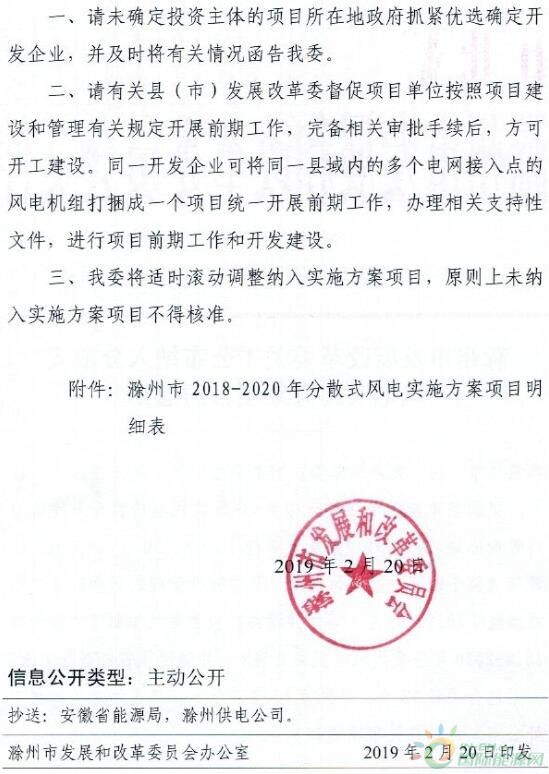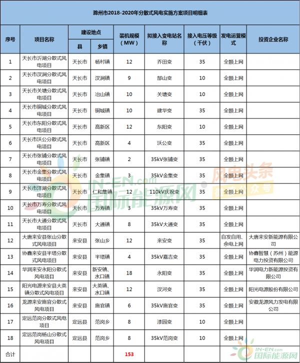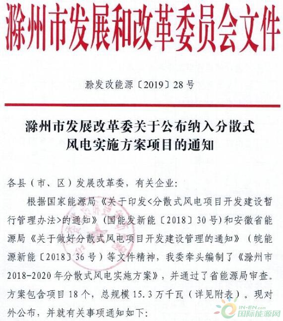 近日,安徽省滁州市发改委发布《关于纳入分散式风电实施方案项目的通知》。《方案》包含分散式风电项目18个,总规模15.3万千瓦。