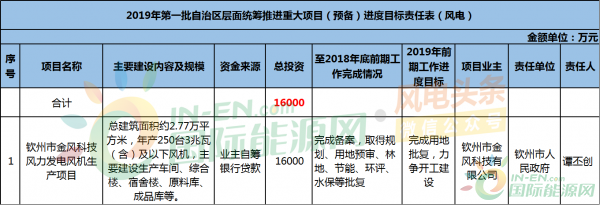 预备项目有1个,为钦州市金风科技风力发电风机生产项目,该项目总投资16000万元。