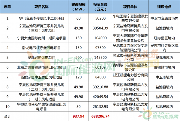 近日,宁夏自治区10个风电项目获发改委核准,总建设规模为937.94MW,总投资金额为688206.74万元(约68.82亿元)。其中: