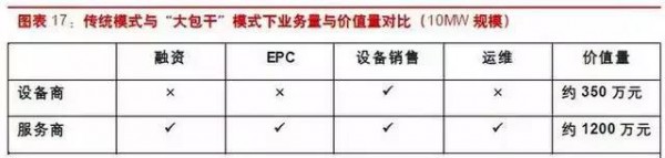 以1万kW的分散式项目为例,若只提供设备,假设销售价格3500元/kW,净利率10%,净利润约350万元;若以“大包干”模式提供全面服务,项目融资租赁的收益率按8%测算,可带来300万元的收益;EPC业务按10%的毛利率,3%的净利润率可带来200万元的收益;设备业务350万元的收益;后期运维,15年内的运维单价为50元/kW·年,折现收益达到300-400万元。