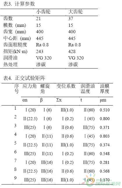 由公式1、2可见,微点蚀安全系数与润滑油膜厚度成正比。在风电齿轮箱设计中,传递功率、速比、中心距及润滑油种类属于设计输入要求,变动空间较小。因此,本文着重研究对许用润滑油膜厚度影响较大的压力角、螺旋角、变位系数及润滑油温。以某2兆瓦风电齿轮箱行星级为例,采用正交试验方法,假设压力角、螺旋角、变位系数及润滑油温均存在三个水平,建立正交试验矩阵分析不同组合下微点蚀安全系数。表3为主要计算参数。表4为正交试验矩阵。表5展示了不同参数水平对许用油膜厚度的影响。