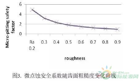 由公式1可见,微点蚀安全系数与齿面粗糙度成反比。基于FZG测试齿轮副对不同粗糙度与微点蚀安全系数的关系进行了分析,详见表1、2。图3展示了微点蚀安全系数随齿面粗糙度的变化。