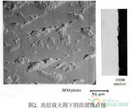图1展示了微点蚀的低倍放大图(15倍),图2展示了微点蚀高倍放大照片。微点蚀会降低齿面精度,增加动载及噪音。通常而言,微点蚀自身危害有限,但极限发展成宏观点蚀,直至齿面失效。