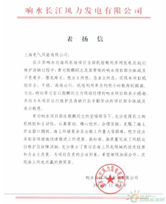 响水现场从第一台吊装开始到现在最后一台结束,共用时9个半月的时间。良好的运行状况,快速的故障响应处理速度,专业的调试、运维、排故的服务水平也受到了业主的好评并发来了表扬信。