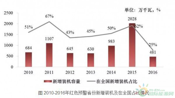 从2017年整体经济形势和能源消费形式来看,基础设施建设投资仍是拉动经济企稳回升的主要手段,同时拉动建材、钢铁等高耗能产品需求,部分地区的电力需求可能同时被拉升,但受经济发展区域不均衡的限制,部分省区的全社会用电量能否扭转负增长形势存在不确定性,难以将其作为缓解限电问题的手段。根据2016年统计结果,红色预警地区合计弃风电量434亿千瓦时,占全国弃风电量的87%,短期内全面暂缓风电项目建设,对缓解上述地区风电并网消纳矛盾有积极作用。已投入运行或在建的输电通道重点用于消纳存量风电项目,但是未来新增装机何时启动,一方面取决于跨省区输电通道的建设速度和可再生能源外送能力,另一方面取决于技术进步和更灵活的市场机制,以增加这些地区就近消纳能力和解决跨区平衡的问题。