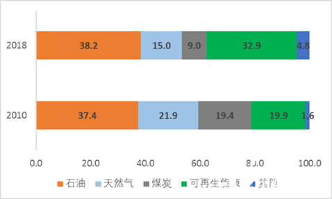 丹麦是传统的海上风电市场,早在1991年就开发建设了全球首个海上风电场。丹麦也是全球能源转型和绿色发展的标杆,2010-2018年,煤炭、天然气等化石能源在丹麦能源消费结构中的比重不断降低,可再生能源的占比由19.9%上升至32.9%,具体如下图所示。2018年的可再生能源消费量中,生物质能约占据76.6%,风电占20.3%,其余为光伏、水电和地热能等。