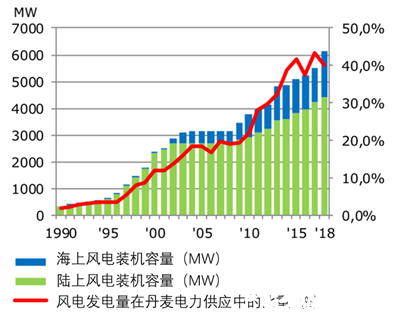 风电在丹麦电力结构中的比重首屈一指。截至2018年底,丹麦风电累计装机容量为6.1 GW,在全国电力装机中的占比为40.6%,其中陆上风电4.4 GW(29.3%),海上风电1.7 GW(11.3%)。风电发电量在丹麦电力供应中的比重由2010年的21.9%上升至2018年的40.2%,如下图所示。