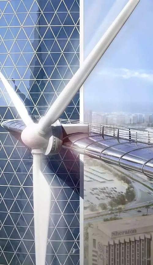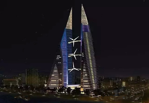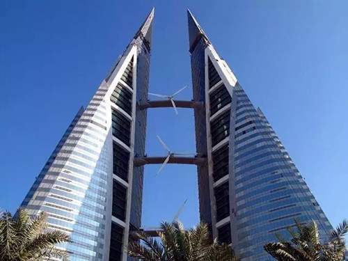 巴林世贸中心是世界上首座将风电机组与大楼融为一体的摩天大楼。