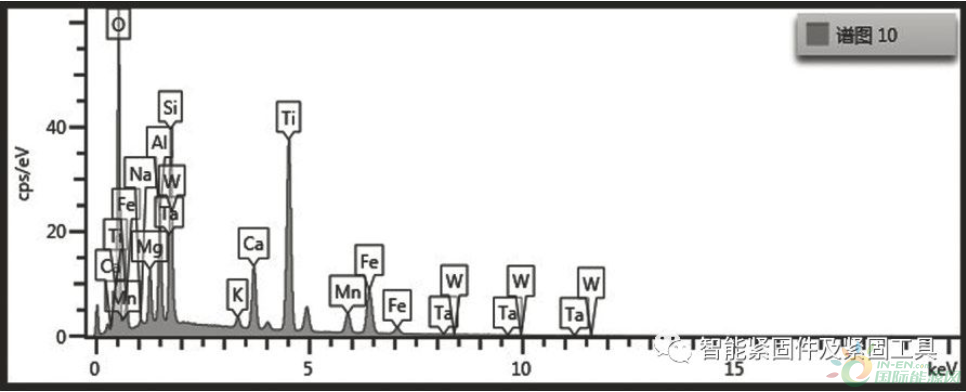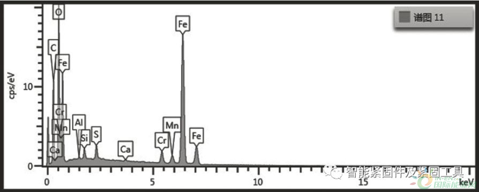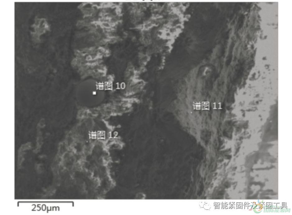 图7 为1# 样品断口表面夹杂物处及母材的能谱分析位置,图8 -图10 分别为图7 中3 个位置的能谱分析结果,可见图谱10 位置Ti 元素含量较高,为含Ti 的夹杂物;其余2 个位置主要元素均为Fe、O,为螺栓母材的氧化产物。