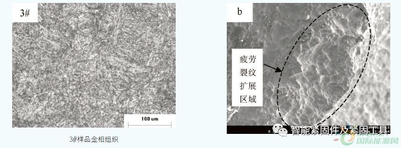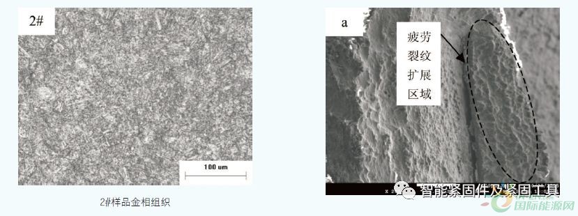 在对4 根螺栓的力学性能试验中发现1#、3# 螺栓屈服强度(Rp0.2)低于GB/T3077 - 015《合金结构钢》要求,2#、3# 螺栓抗拉强度(Rm)低于GB/T3077 - 2015《合金结构钢》要求;虽然4 根试样的常温冲击性能满足GB/T3077 - 2015《合金结构钢》要求,但发生疲劳断裂的1#螺栓冲击功明显低于其他螺栓。冲击功是衡量材料韧性的重要指标,是材料在冲击载荷作用下吸收塑性变形功和断裂功的能力,冲击功越低,材料表现出来的脆性越高,韧性越低。冲击功偏低使螺栓在应力作用下更易产生裂纹,产生裂纹后,裂纹的扩展速度更快。