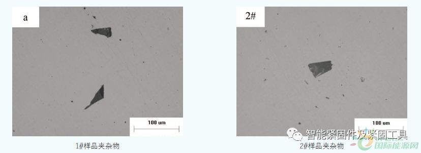 螺栓基体金相组织为回火马氏体(图3b),在螺纹处存在由螺纹根部向螺栓内部扩展的微裂纹(图3c)。图4 为2# - 4# 样品母材基体内夹杂物形态照片,可见3 个样品中均存在少量尺寸不超过5μm 的夹杂物,参照GB/T10561 - 2005《钢中非金属夹杂物含量的测定标准评级图显微检验法》,夹杂物评级为D 类0.5 级。