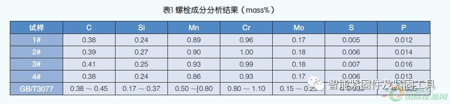 采用德国Spectrolab-M11 型直读光谱仪对4 根断裂螺栓进行化学成分分析,其结果如表1 所示。螺栓设计材质为42CrMoA,根据试验结果,除Mn 含量略高于GB/T3077 - 2015《合金结构钢》要求的成分上限外,主要合金元素Cr、Mo 含量与设计材质相符,S、P 含量不超标。