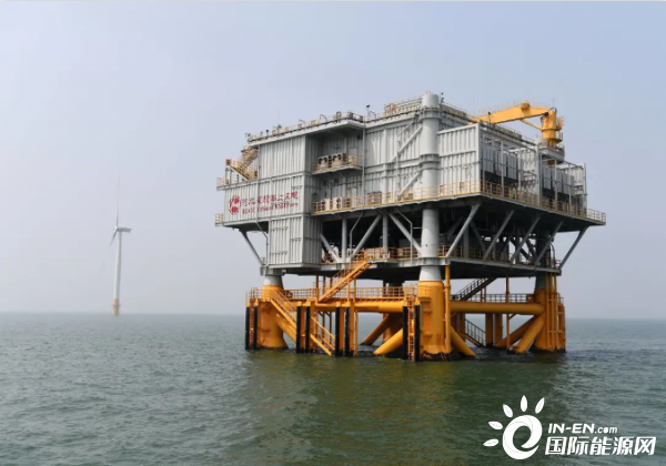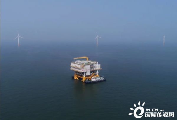 7月19日拍摄的唐山乐亭菩提岛海上风电场升压站。