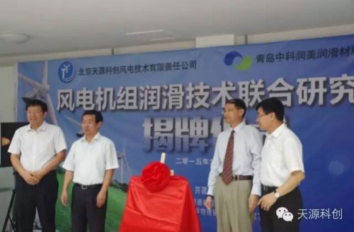 9月18日上午,北京天源科创风电技术有限责任公司(简称天源科创)-青岛中科润美润滑材料技术有限公司(简称中科润美)共同建立的 “风电机组润滑技术联合研究中心”揭牌仪式在青岛市崂山区中国科学院兰州化学物理研究所青岛研发中心内隆重举行,青岛市和崂山区政府领导、中科院、中科润美、天源科创等领导及专家莅临现场。
