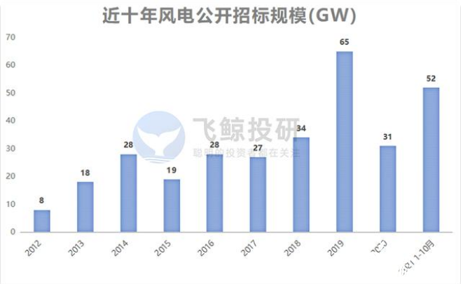 1. 2019年: 受补贴退坡的影响,2019年招标规模高增,达到历史最高的65.2GW;因此导致了2020年抢装潮,2020年风电装机规模达到71.67GW,同比增长178%。