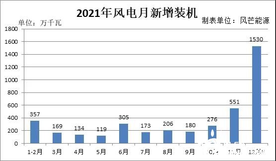 以12月也新增551万千瓦(11月新增值)来算,2021年风电有望实现新增装机30.21GW。