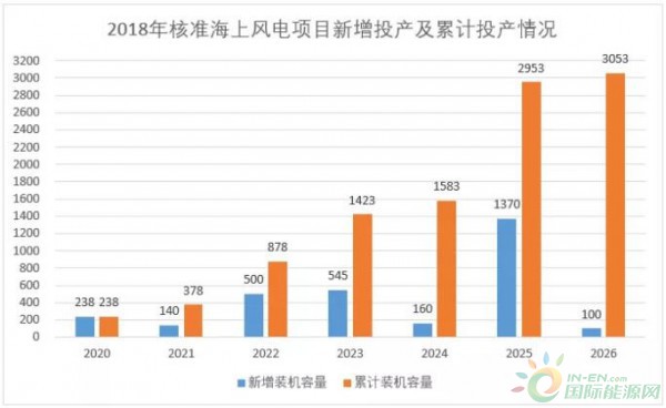 图3 2018年核准的广东省海上风电项目投产年分布及当年累计投产容量
