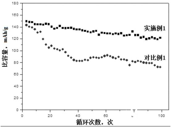 上图是实施例1和对比例1制得全固态锂电池的比容量-循环次数测试曲线图; 从电镜扫码图中可以看到,经过100次循环后,实施例中(左侧图)正极片固态颗粒之间依然保持比较紧密的状态,而对比例中(右侧图),正极片中则出现了较为明显的缝隙,各个颗粒之间接触松散了很多。这就是电池循环后,电池体积变化,使得性能明显变差的原因。