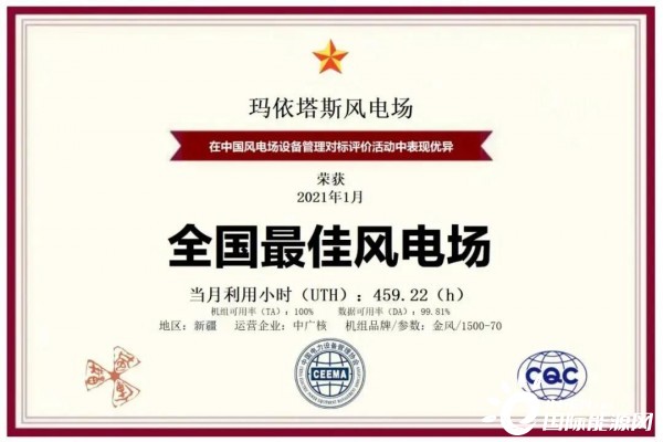 该奖项由中国电力设备管理协会根据《中国风电场设备管理对标评价办法》和《中国风电场设备管理对标评价技术规范》等规则评选,每月在全国范围内仅评选出1个“全国最佳风电场”,每年根据对标指数排名情况进行年度评选。在近日公布的1月排名中,中广核玛依塔斯风电场凭借459.22h发电小时数、100%机组可用率、99.81%数据可用率等指标的优异表现,当选“全国最佳风电场”。