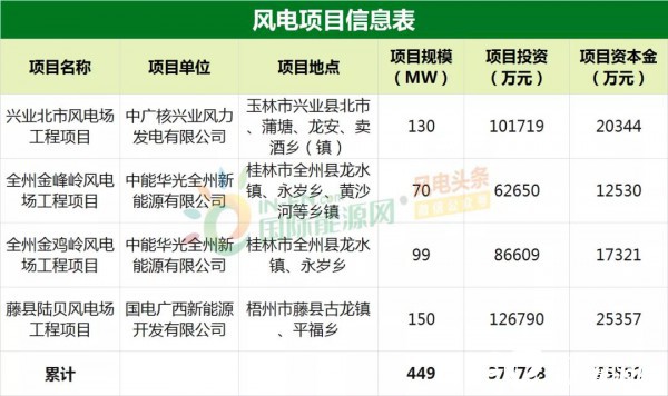 国际能源网/风电头条(微信号:wind-2005s)获悉,近日,广西壮族自治区发改委对辖区内4处风电场工程进行了核准。据统计,本次核准的风电场工程累计装机规模达到449MW,项目总投资为377768万元。
