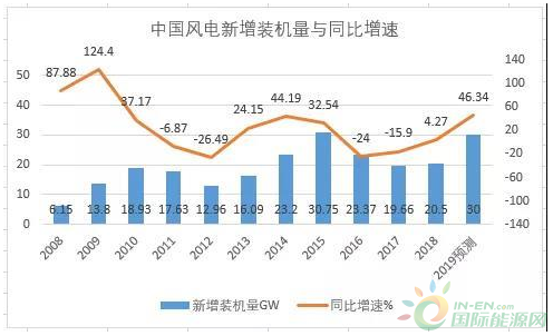 按照当时市场上几家券商的普遍预测,在多重利好因素刺激下,2019年全国风电新增装机可能达到30GW左右,相比于2018年20.5GW装机,增速将超过46%,而这一增速将创2010年以来新高。