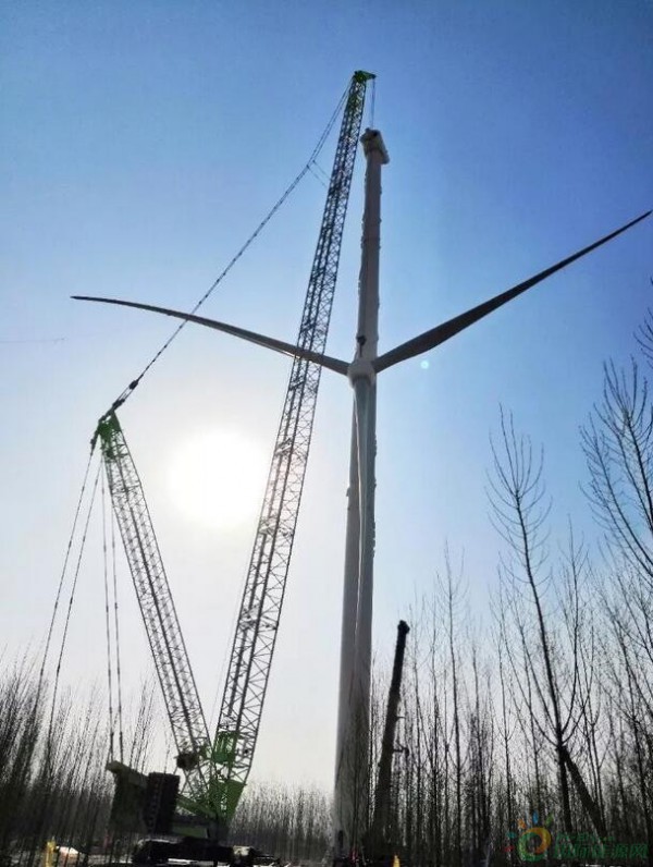 首台吊装的2.3兆瓦风机风轮直径131米,安装高度为140米,系目前国内陆上风电项目最高安装高度。为确保吊装顺利和安全,项目部制定出吊装方案和应急预案。3月25日10时10分,在对吊装机具进行专项检查和现场安全技术交底后,各岗位人员各就各位,开始吊装。4月1日17:18分,2.3兆瓦风机叶轮叶片全部吊装就位,首台风机吊装工作顺利完成,并达到风机吊装的一个新高度,为南宫风电项目的风机吊装开了一个好头。