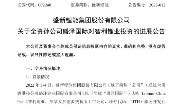 2022年,盛新锂能通过全资香港孙公司盛泽国际认购了智利锂业的非公开发行的股份,并对所认购股份获配的认股权证进行了行权,投资金额累计3455.4加元(按照当时汇率折算约合人民币1.755亿元)。收购完成后,公司持有智利锂业的股权比例为19.35%,为智利锂业第一大股东。在两周之前,盛新锂能曾一度对澎湃新闻记者表示,在收到加拿大政府的通知后,公司方面与加拿大政府相关部门进行了多次沟通,事情仍然有缓和的余地。