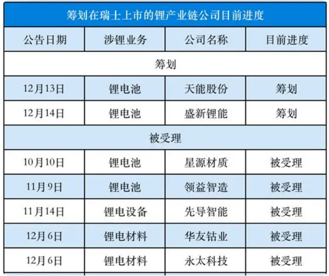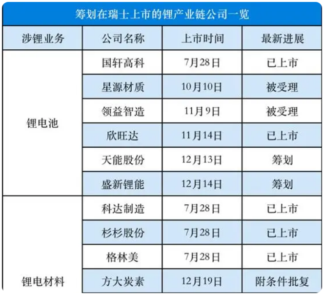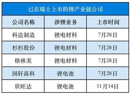 自今年7月28日中瑞证券市场互联互通存托凭证业务正式开通以来,我国首批四家上市公司在瑞士证券交易所上市。这四家公司分别为科达制造、杉杉股份、格林美、国轩高科。此后,又有11家涉锂企业筹划赴欧上市,其中欣旺达在11月14日已成功登陆瑞交所。