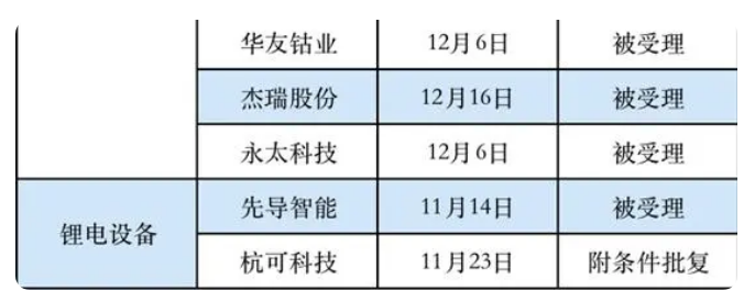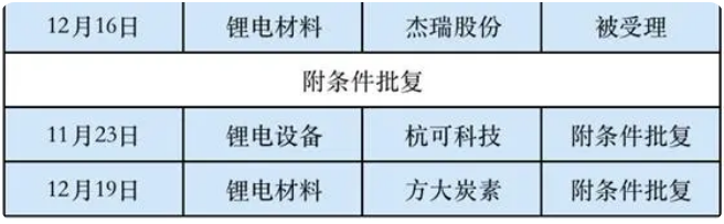 在10家尚在奋斗的公司中,目前进度最领先的是杭可科技和方大炭素。前者于11月23日获得瑞交所的附条件批准,后者在12月19日获得附条件批准。