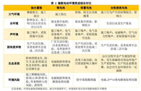 抽水蓄能主要对区域生态环境存在影响,包括水文情势改变、施工期水土流失隐患、运行期可能的水库渗漏 (潘文国 和 杨彪 2019)、以及物种变化等,需要注意植被和物种配置,并保证动物的顺利迁移。表 2 对目前建设规模最大的抽水蓄能、电化学储能中占比最高的锂电池、传统铅酸电池和相全钒液流电池进行了环境效益对比。