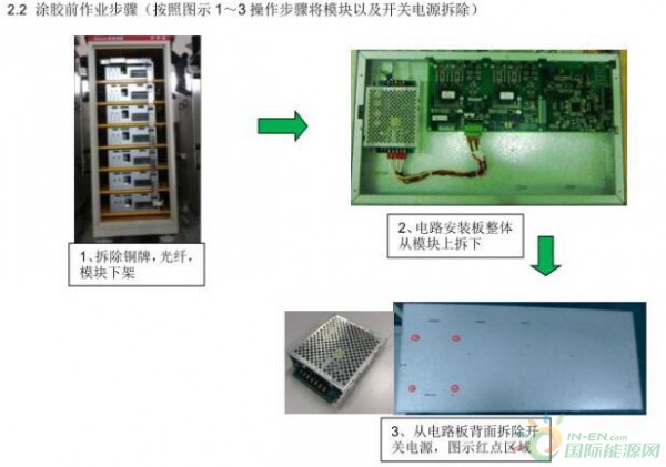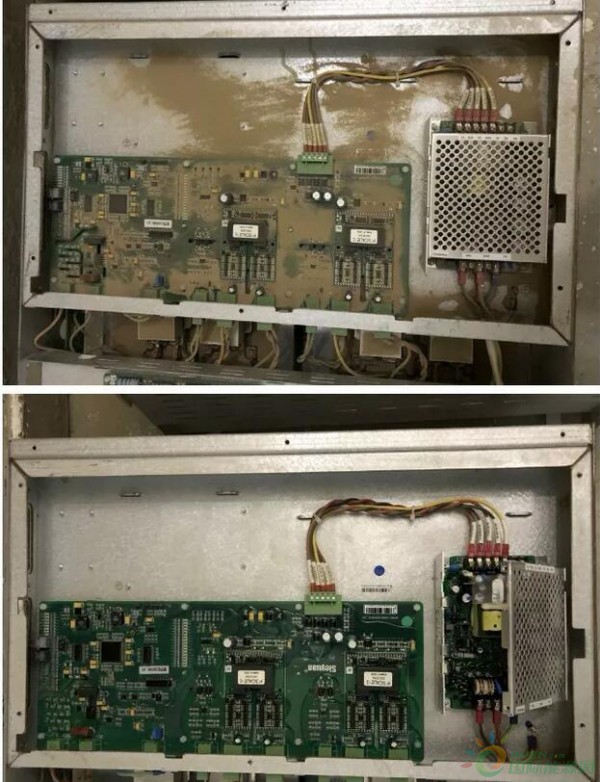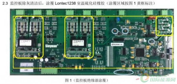 新疆烟墩风电项目自2017年4月1日投产,地处于九大风区之一的哈密东南部风区,地处戈壁,起风时伴随着大量沙尘。SVG风冷系统正常运行带入大量沙尘,链接监控板积压灰尘较多导致放电烧毁,造成SVG设备跳闸事故,严重威胁设备正常运行。项目首先对室外纱窗进行全面整改,虽初步取得成效,但还是未解决根本问题,设备还是存在跳闸风险。经项目与SVG设备厂家沟通,厂家提出监控板和开关电源板涂胶方法,将开关电源除灰清洁后,涂覆Lontec1238 室温硫化硅橡胶,防止灰尘积压在链接监控板上受潮导致放电烧毁板件。