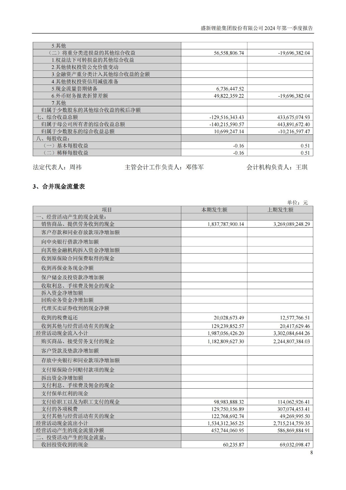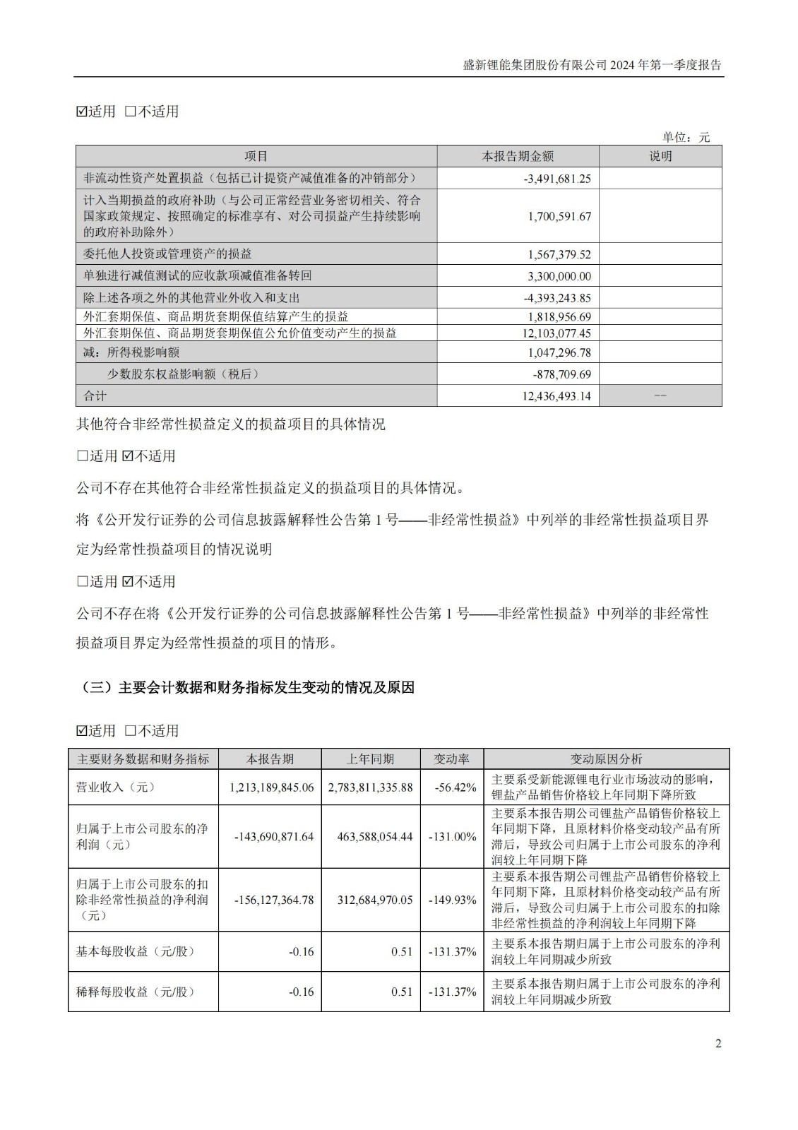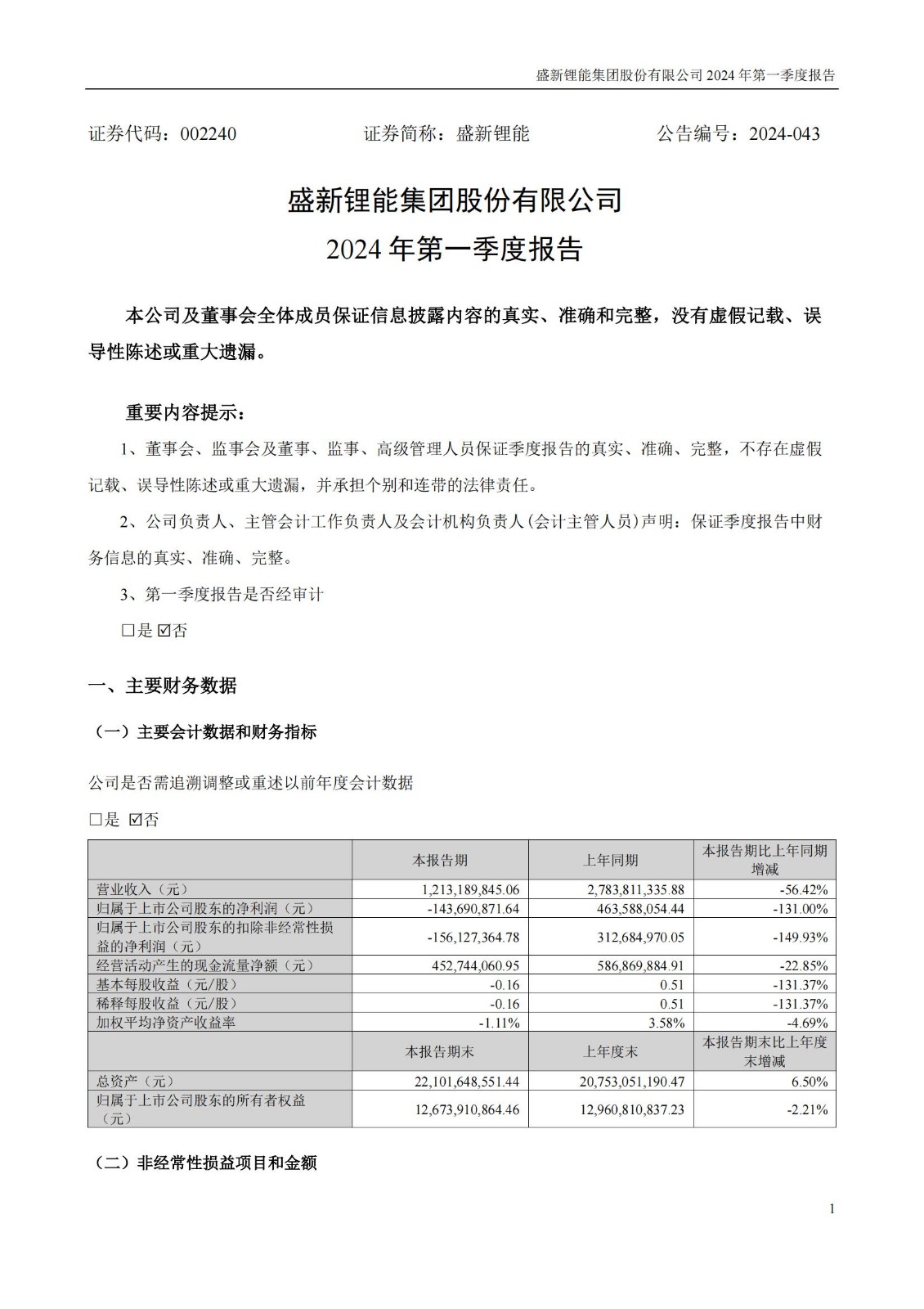 国际能源网获悉,4月28日,盛新锂能晚间发布一季度业绩公告,2024年第一季度营收约12.13亿元,同比减少56.42%;归属于上市公司股东的净利润亏损约1.44亿元。