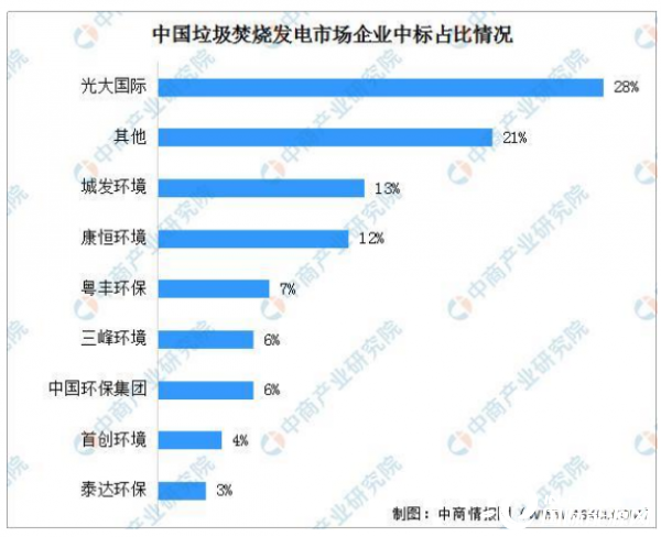 另外,从企业中标情况来看,2019年我国垃圾焚烧发电市场中,企业中标占比最大的为光大国际,占比达28%;其次为城发环境,占比为13%;康恒环境随后,占比为12%。