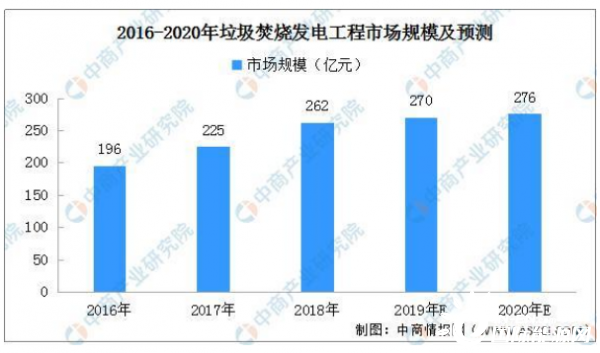 2017年,我国垃圾焚烧发电工程市场规模超过200亿元。随着政策利好、城镇化加快等因素影响,市场持续扩大。2019年中国垃圾焚烧发电工程市场规模约为270亿元,预计2020年将进一步扩大至276亿元。