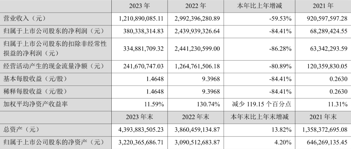 国际能源网获悉,4月18日,融捷股份披露2023年年报。2023年,公司实现营业总收入12.11亿元,同比下降59.53%;归母净利润3.80亿元,同比下降84.41%。