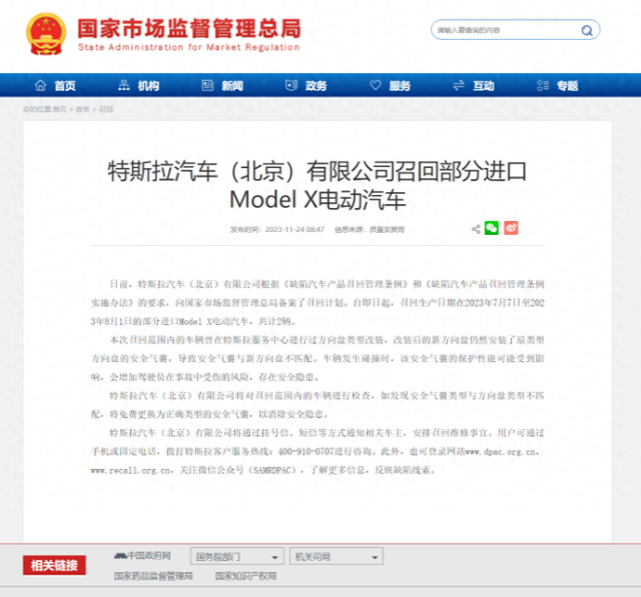 11月24日消息,据国家市场监督管理总局,日前,特斯拉汽车(北京)有限公司根据《缺陷汽车产品召回管理条例》和《缺陷汽车产品召回管理条例实施办法》的要求,向国家市场监督管理总局备案了召回计划。自即日起,召回生产日期在2023年7月7日至2023年8月1日的部分进口Model X电动汽车,共计 2 辆。