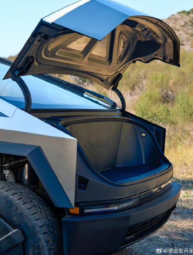 还有其他一些照片,展示了车辆的玻璃顶的内部视角,以及车辆的前行李箱、侧后视镜和外观。前行李箱上有用特斯拉的涂鸦风格的字体写的“Cybertruck”字样,虽然看起来不是特别深,但还是有一定的宽度。
