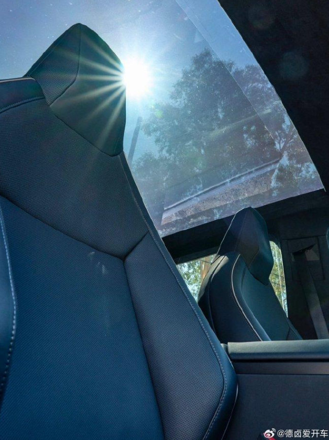 这些照片展示了 Cybertruck 的中控触摸屏界面、座椅、玻璃顶、前行李箱等。从其中一张照片可以看到,Cybertruck 在仪表板和侧面板上有白色的装饰,这与最近在得克萨斯州奥斯汀的特斯拉超级工厂拍到的车辆相同。还可以从这张照片中看到其他一些细节,包括驾驶员侧门的储物格、中控台等。