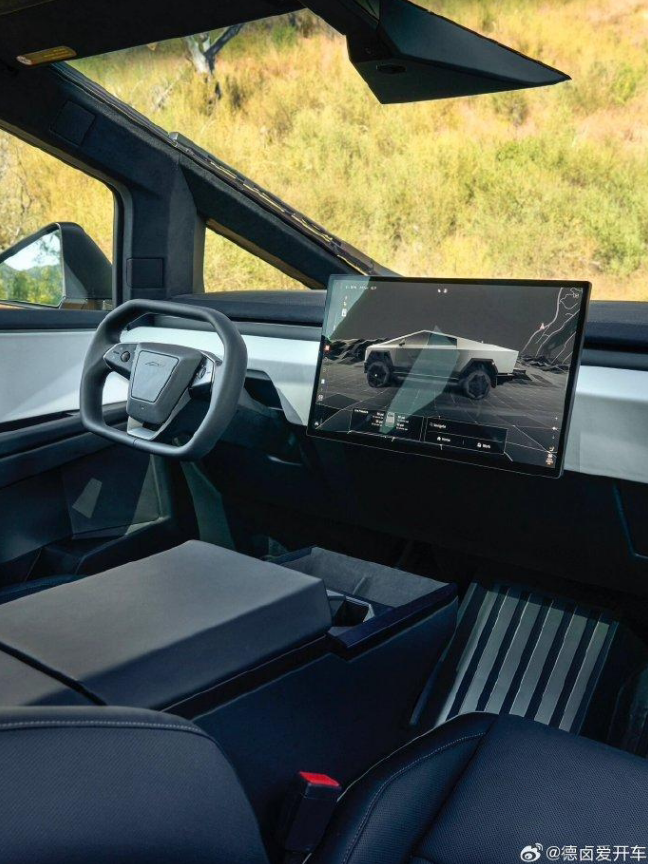 其中一张照片是 Cybertruck 的中控用户界面的特写,显示该车会有专版的中控 UI,功能不同,车控也会集成更多的按钮。