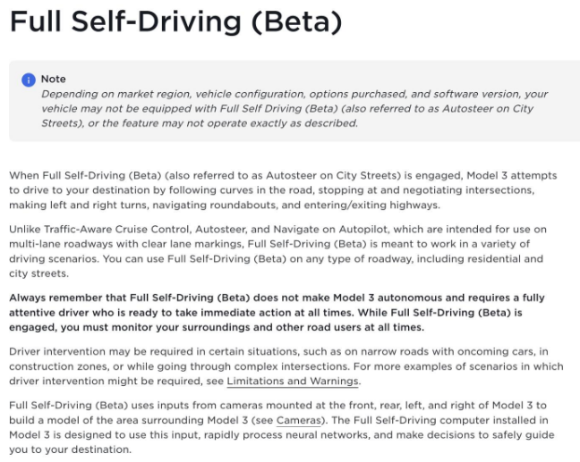 特斯拉在车主手册中指出:“根据地区、车辆配置、购买的选项和软件版本不同,您的车辆可能没有配备 FSD Beta(也称为城市街道自动驾驶),或者该功能可能不会如描述那样精确运行。”