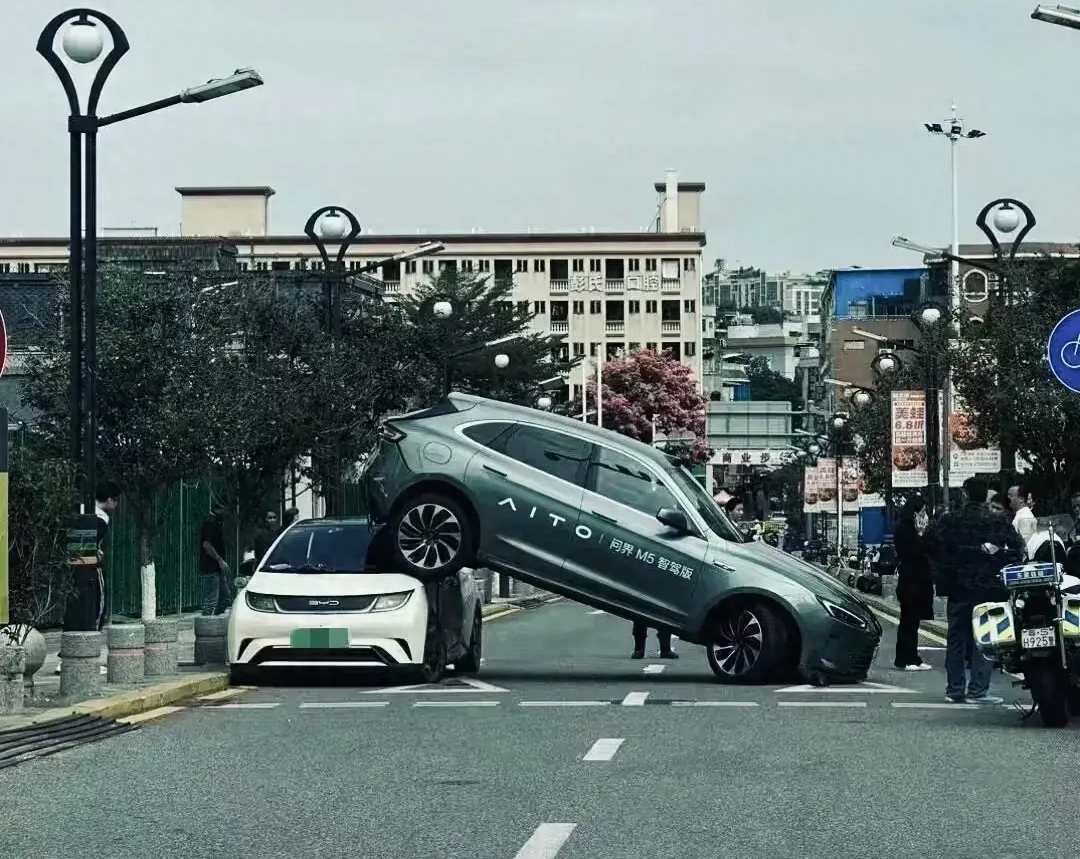 11月13日,一位车主在东莞寮步用户中心试驾时,驾驶问界M5智驾版车辆倒车撞上了路边一辆比亚迪海豚汽车,并且部分车身压在了比亚迪海豚的半个车身上面。
