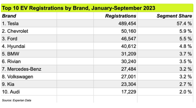 根据 Experian 的车辆注册数据,特斯拉 Model Y 和 Model 3 是今年一月至九月期间在美国注册量最高的两款车型,远远超过了其他竞争对手。此外,电动汽车在这段期间的注册量占总市场的 7.4%,而在 2022 年同期,这一比例仅为 5.2%。