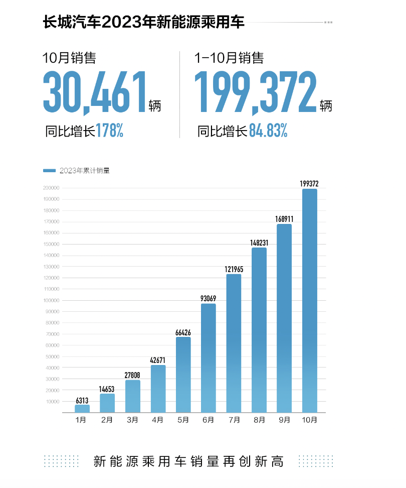 11月1日,长城汽车发布新能源销量数据,10月销售30,461台,同比猛增178%;1-10月累计销售接近20万台,同比大涨84.83%。显然,长城汽车在新能源业务的布局,进一步有了收获。